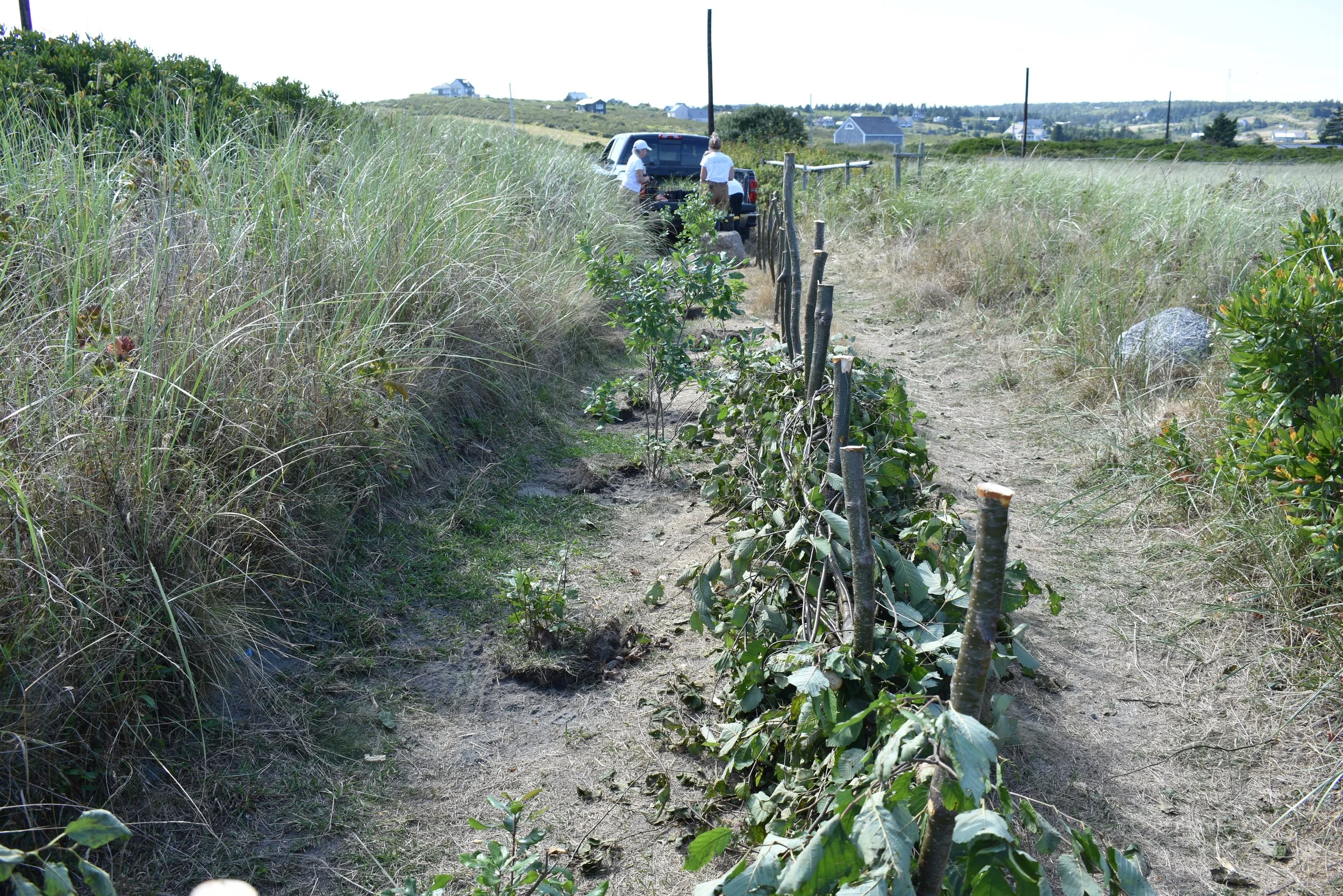 Rather than restoring a destroyed habitat, the alterations to this system were mainly to adjust human behaviour to better protect the dune system. A wattle fence made of alder stakes and branches dissected a right of way on the property to only allow for pedestrian traffic. The right of way had originally been the width of a large vehicle, allowing vehicles to drive onto the beach and compress the ground below. Shrubs were planted on the restored part of the right of way in an effort to release some of that compaction.