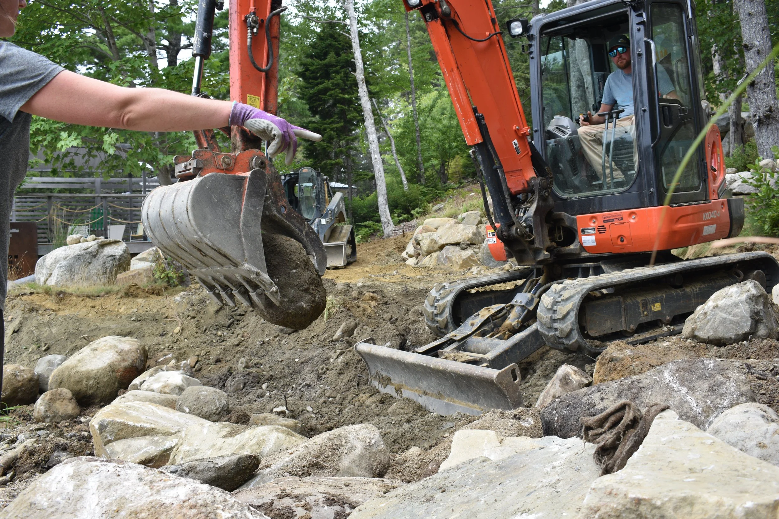 CBWES directs Manzer Brothers on where to place repurposed retaining wall rocks in the riparian zone.