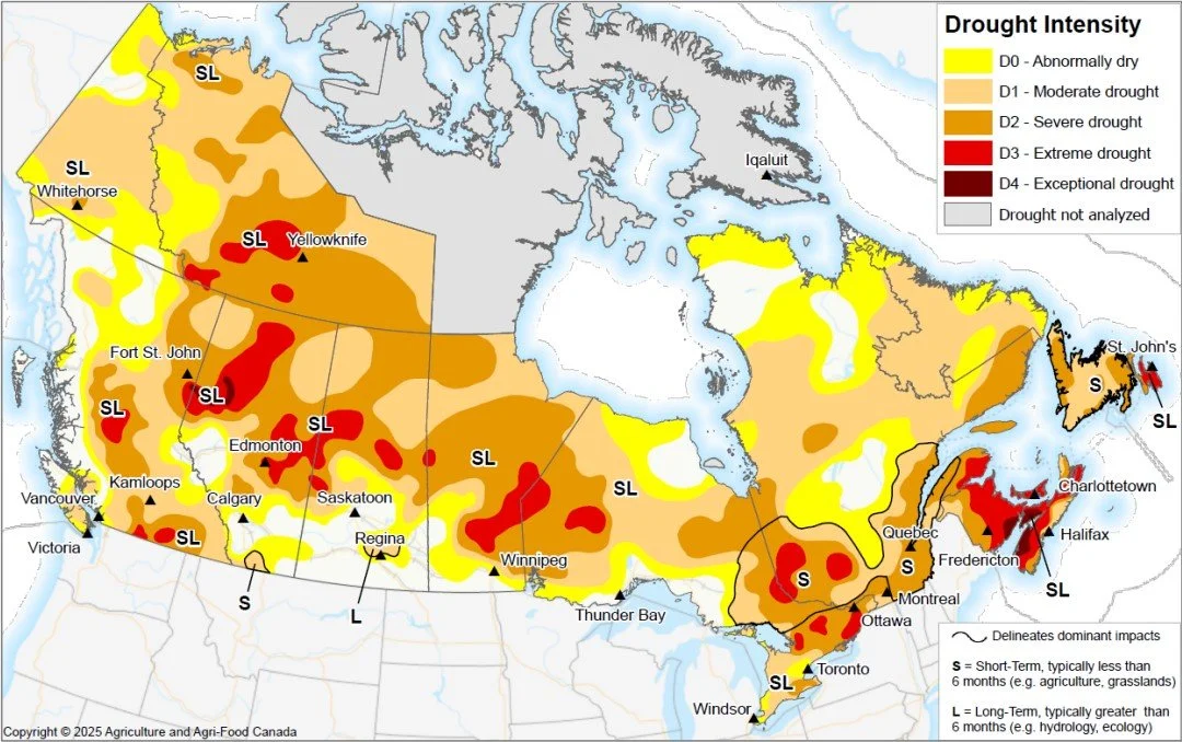 Nova Scotia experienced severe, extreme, and in some areas, exceptional drought conditions by September 30, 2025. (Source: Agriculture and Agri-Food Canada Drought Monitor).